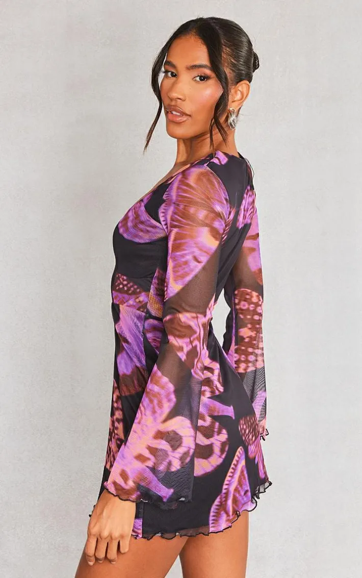 Dare to stand out from the crowd in this purple abstract print mesh underbust detail shift dress, you won’t be able to resist. Made using a purple abstract print mesh material with an underbust design and a shift style, you’ll be adding this dress straight to your basket. Pair with clear slip-on heels and your fave accessories for a dreamy date night look.