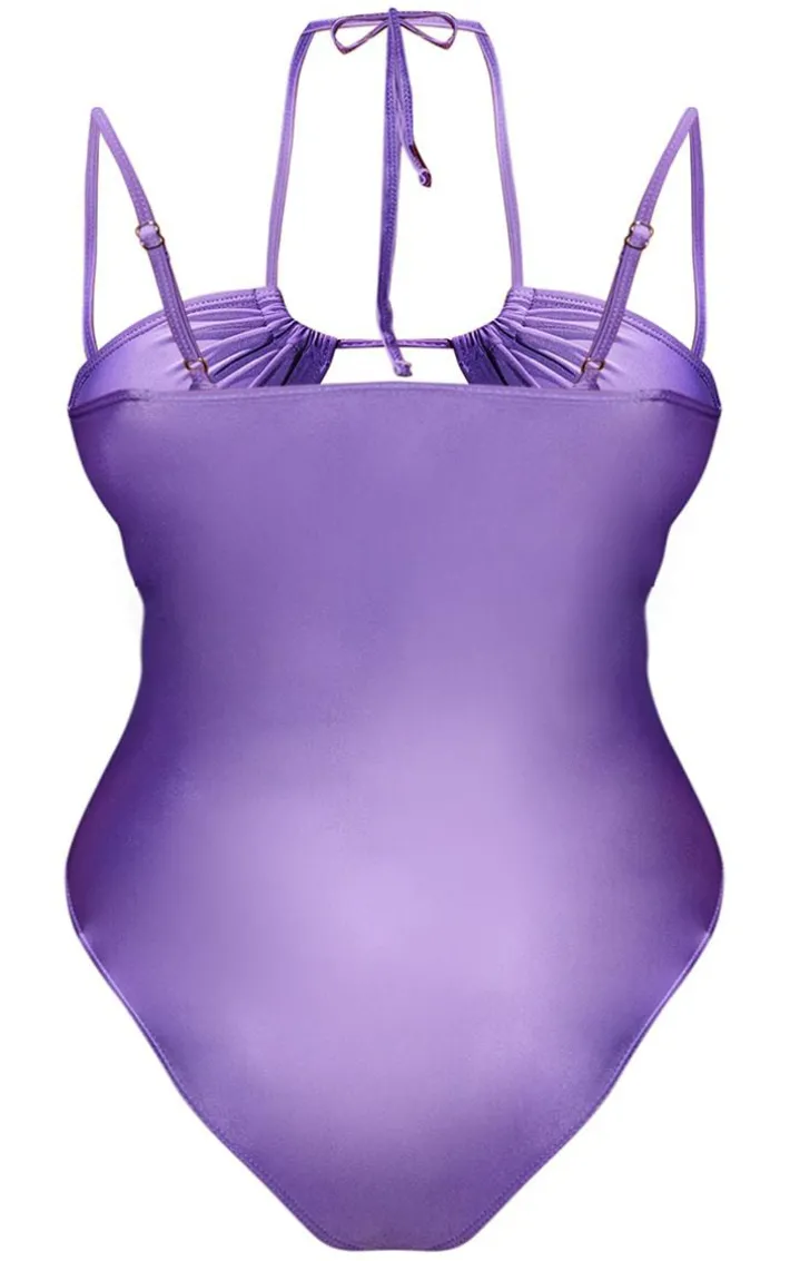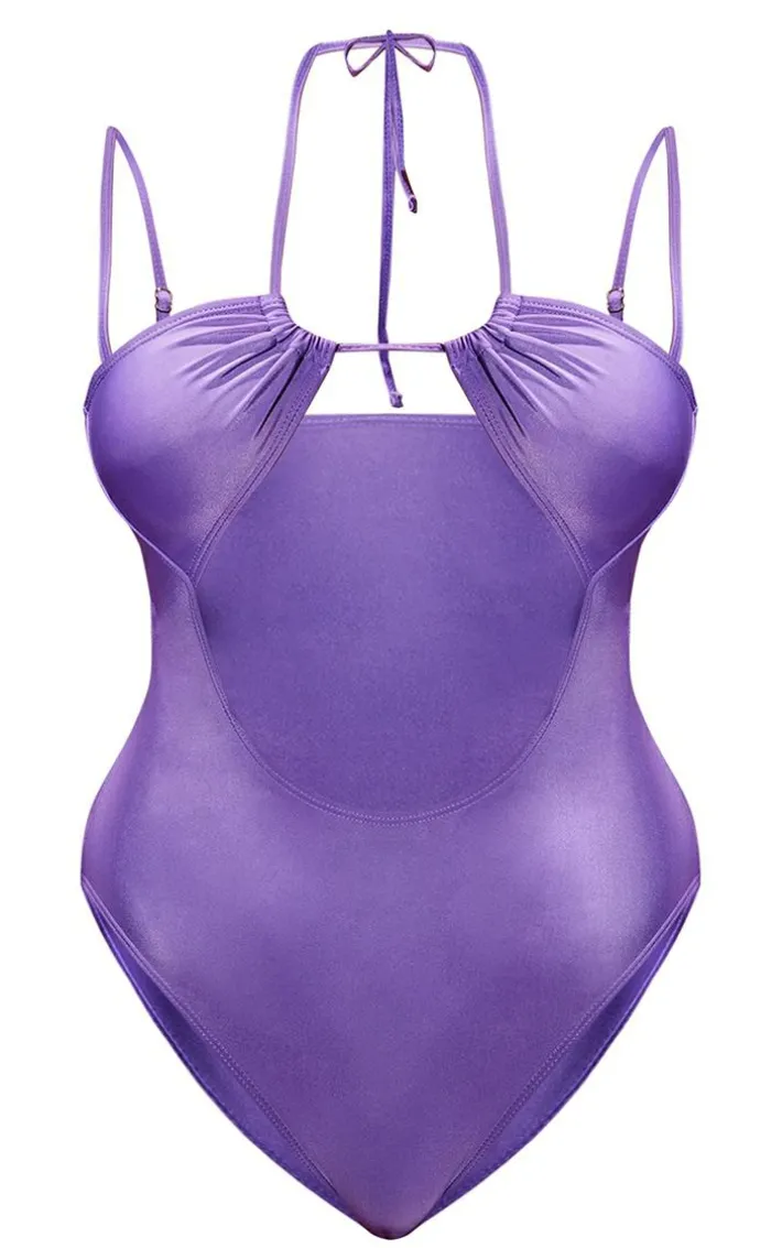 Add some statement tones into your look with this purple cut out strappy swimsuit. This swimsuit is brought to you in a purple material with a cut-out design and a strappy style, how could you turn this down? This swimsuit is calling your name. Style this with sandals and accessories for a flawless finish.