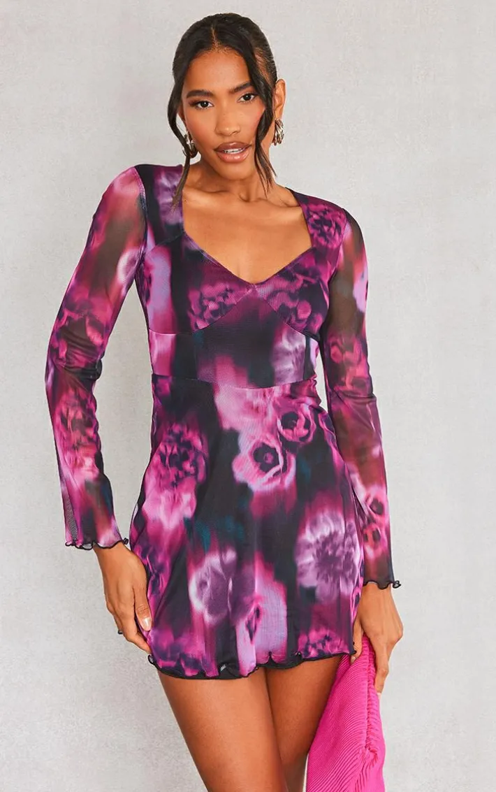 Make everyone stop and stare this weekend with this purple floral print mesh underbust detail shift dress. Its purple floral print mesh material hugs your figure in all the right places whilst its under-bust detail adds that extra luxe touch. This shift dress is seriously dreamy and perfect for your upcoming weekend plans. All you need to add is strappy heels, gold accessories and a mini bag for a fool-proof finish.