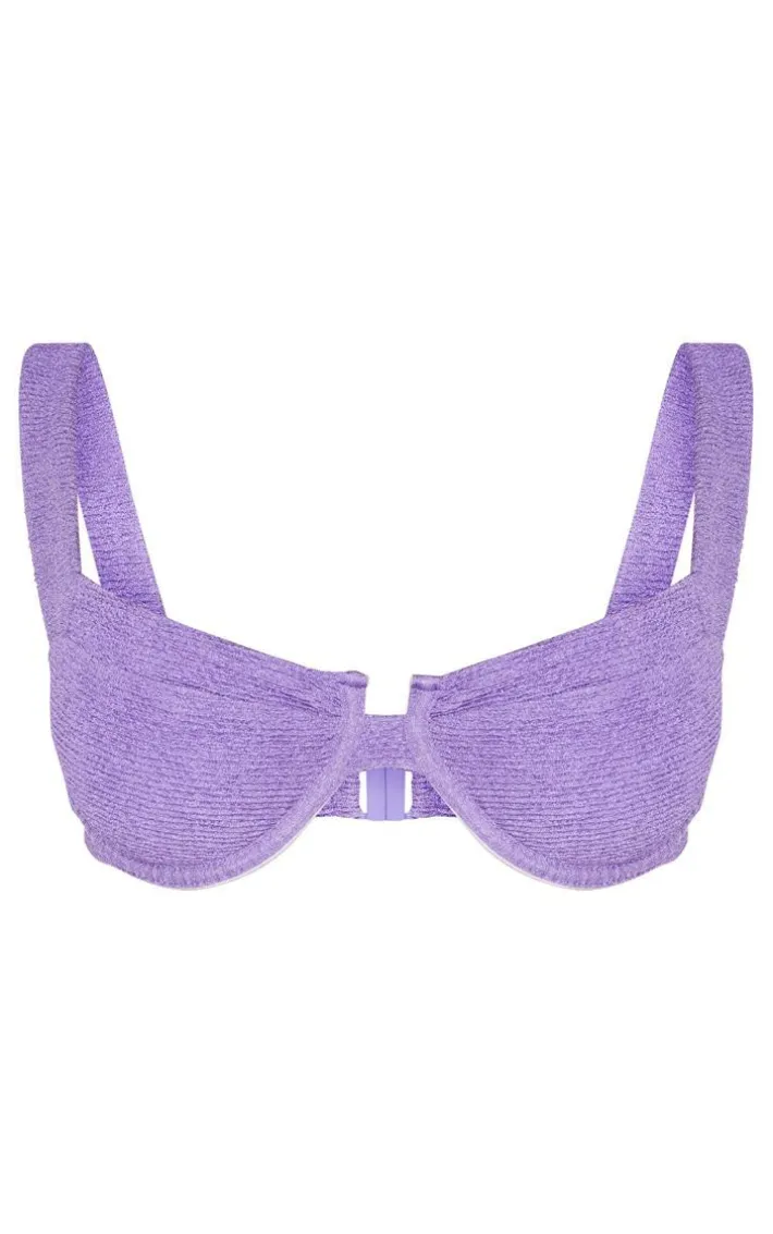 It’s bikini season and we are obsessing over this dreamy bikinitop. Featuring a purple crinkle fabric with a underwire design and square neckline, team with the matching bottoms for the perfect poolside attire.