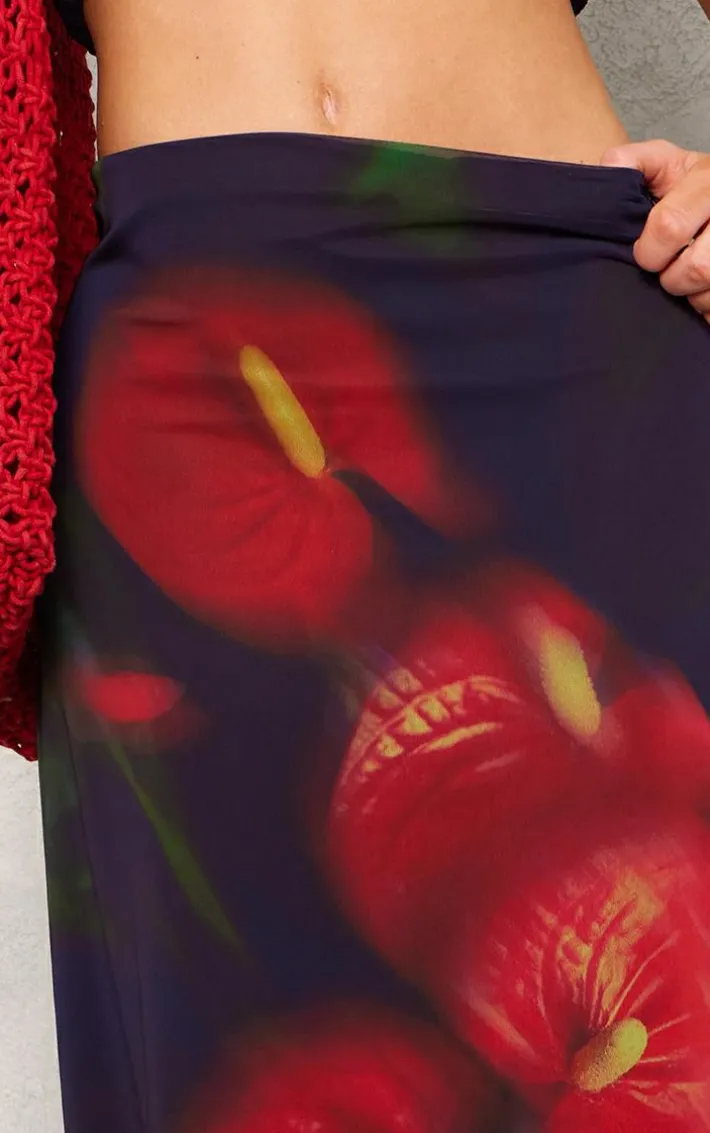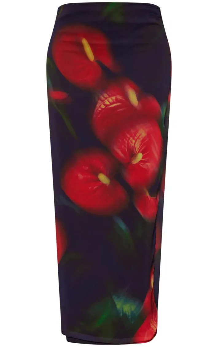 Your wardrobe is calling out for this red abstract flower print mesh maxi skirt for your new season look. Whether you’re switching up your off-duty wardrobe for the summer or need a last-minute weekend fit’, this maxi skirt has got you covered. Its red mesh material and abstract flower print, how could you resist? Pair with a crop top, your fave clear heels and a statement bag clear heels, it’s a definite yes from us.