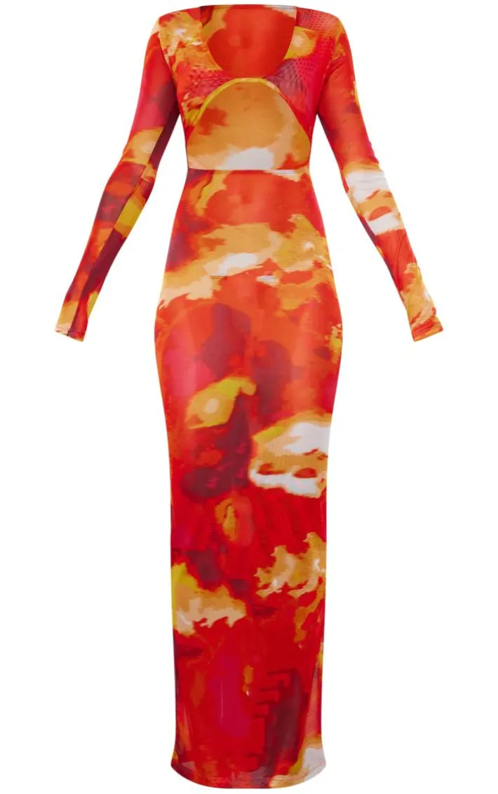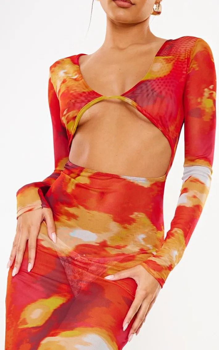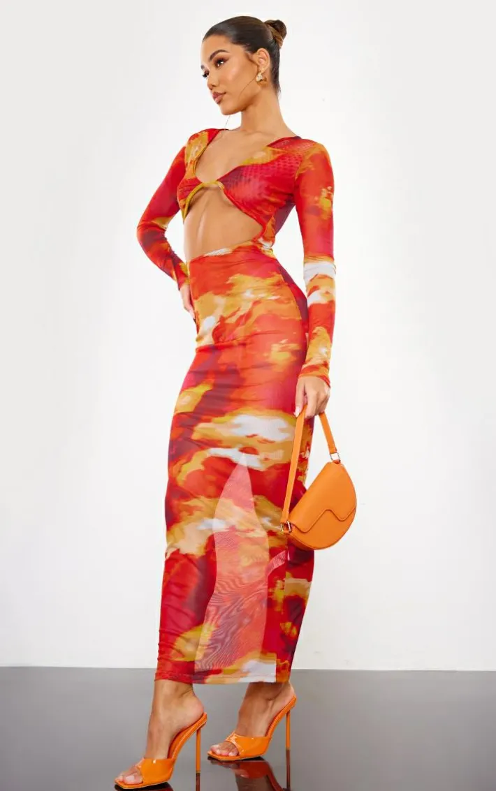 Turn heads for all the right reasons with this red abstract print cut out long sleeve mesh maxi dress. This dress is brought to you in a red abstract mesh print material with a cut-out front and long sleeves, what more could you ask for? With It’s statement hue you’re sure to have all eyes on you this season. Simply wear with chunky gold hoops, high heels and an orange mini bag to secure this dreamy ‘fit.