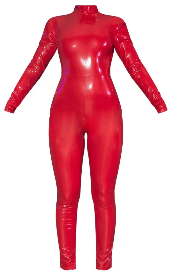 Show off your shape this halloween with this statement jumpsuit. Featuring a red vinyl material, long sleeves and a backless design, style this with strappy heels for a combo we are crushing on.