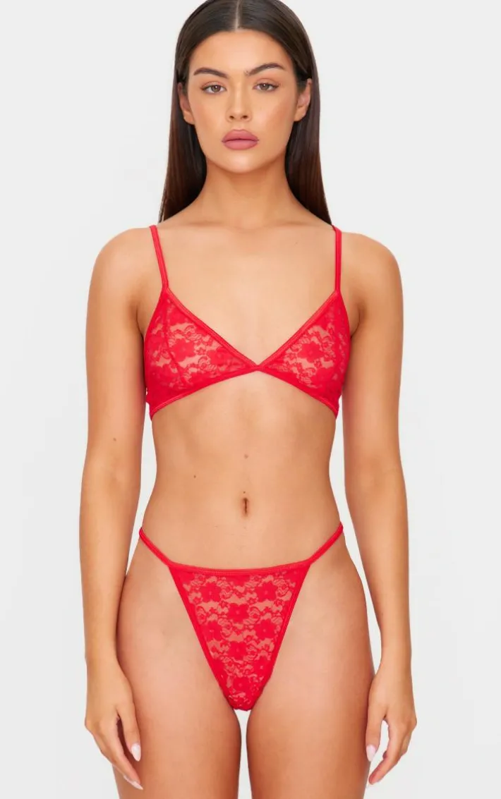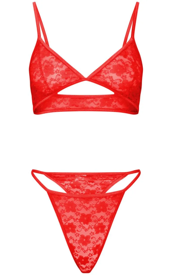 Update your lingerie collection with this fierce set. Featuring a flattering bra with triangle cups and a matching thong both in a red lace material, we are totally obsessed. Style this under your fave evening outfit or dare to bare all and wear this set solo.