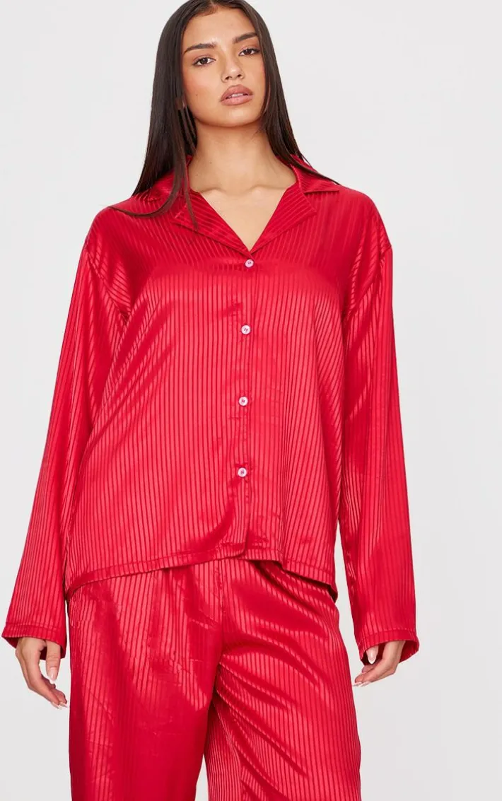 This red jacquard stripe satin long PJ set is a must have for your cosy collection. Brought to you in a chic red hue, with a luxe jacquard stripe design and a soft satin material, this PJ set is your new go-to. Style with some slippers and an eye mask to really complete the style.