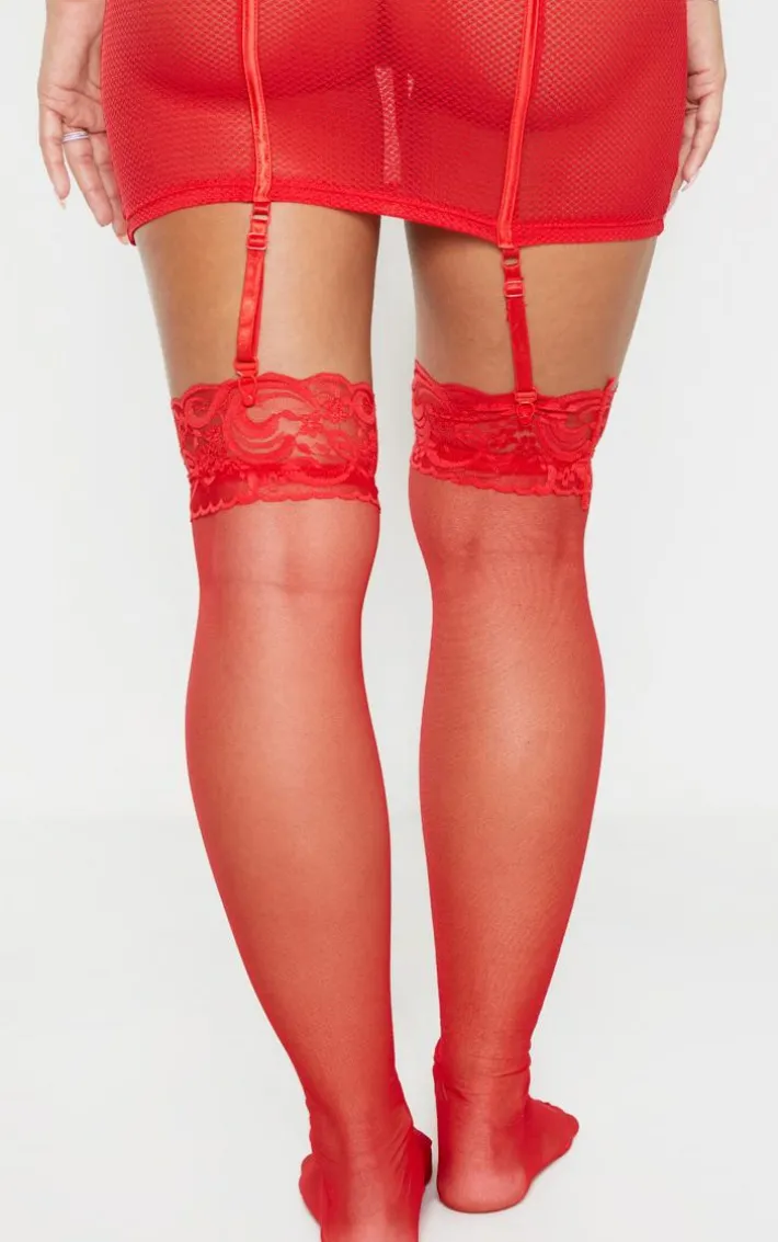 Make a bold after dark look in the hold ups. Featuring a red sheer fabric with a lace top detailing, team with your existing red lingerie pieces to complete the look.