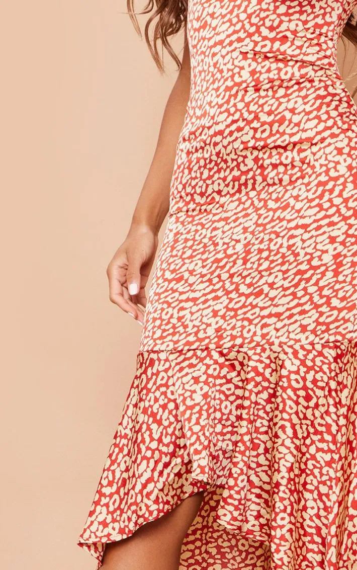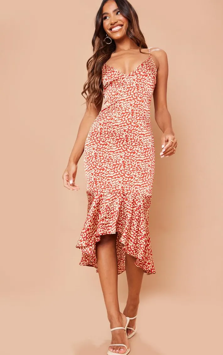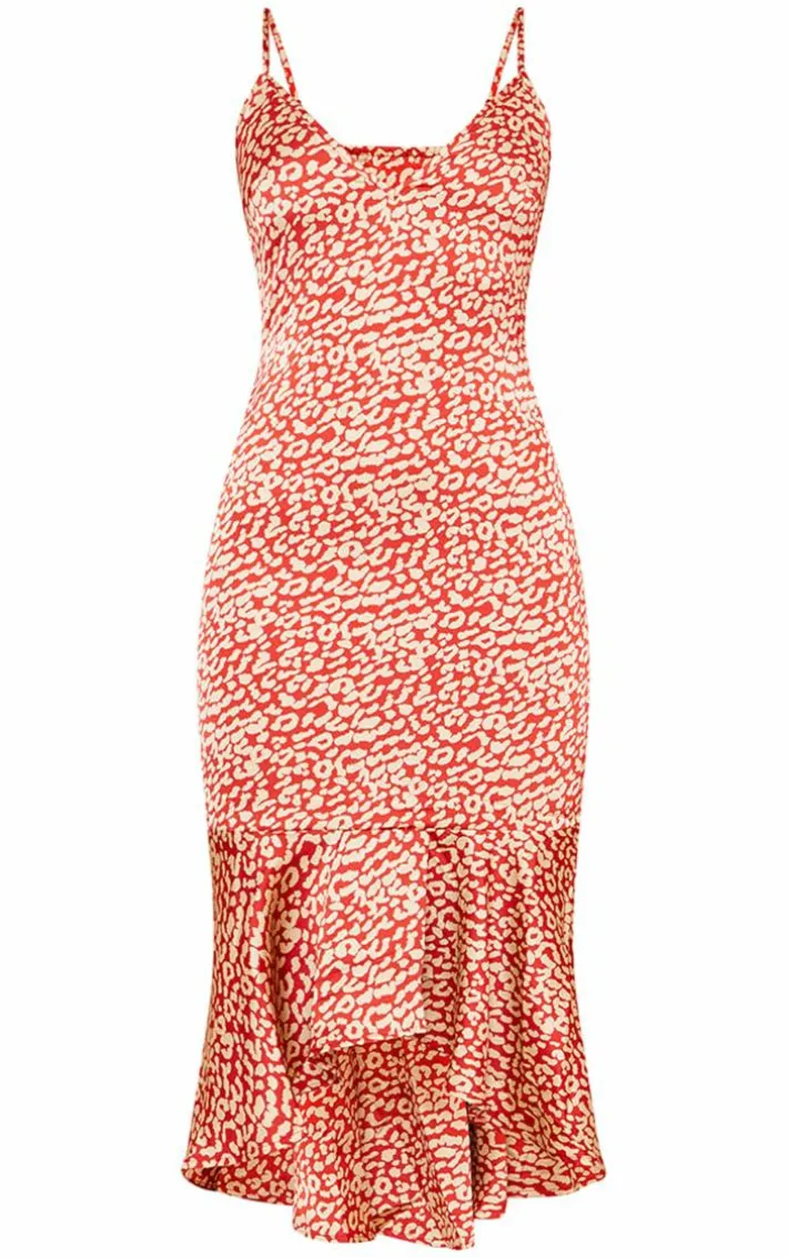 Worship your shape with this midi dress. Featuring a red leopard print satin fabric with a frill hem design and thin shoulder straps, style it with some strappy heels and a mini bag for a special occasion look.