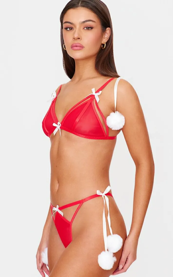 Turn up the heat in this red mesh Christmas pom pom lingerie set. Brought to you in a red hue mesh material with a Christmas pom pom detail, this lingerie set is a must have. Elevate the look with gold accessories, and your go-to slippers or socks for a look that’s set to sleigh this season and beyond, it’s a yes from us.
