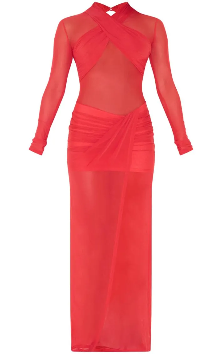 It’s official, we’re obsessed with this red mesh crossover bust detail ruched skirt maxi dress. Brought to you in a red mesh material with a crossover bust detail and ruched skirt design, this maxi dress is a must have. How can you resist? Style with black heels and simple accessories for a figure-flattering finish we can’t get enough of.
