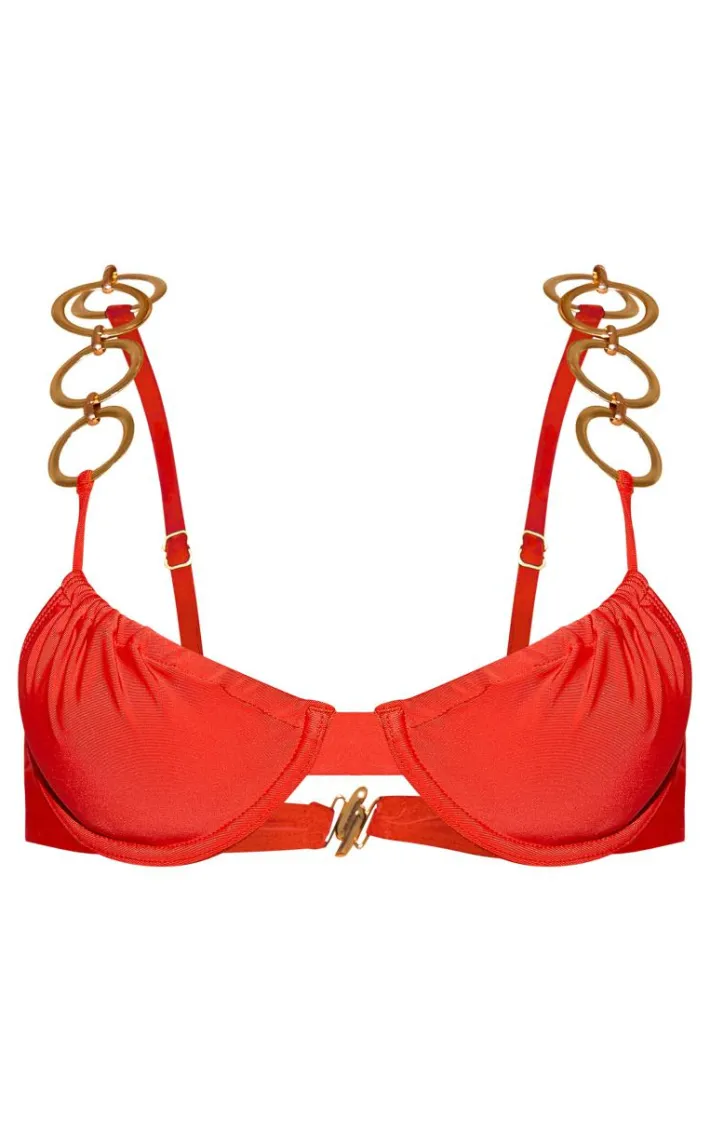 Get ready to have all eyes on you in this red o ring strap underwired bikini top, we’re seriously in love. This bikini top features a red material with o ring straps and a structured underwired design. Pair this underiwred bikini top with the matching bottoms and your fave accessories for a look everyone will remember.