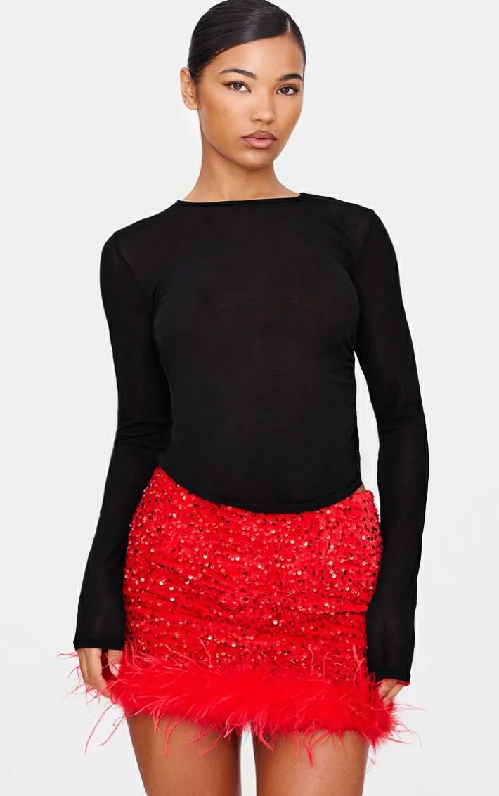 This red premium velvet sequin feather hem mini skirt is a must have for the celebration season ahead. Brought to you in a statement red tone, with a premium velvet material, sequin detailing and feather hem design, you won’t blend into the crowd with this one. Team with a black mesh top and red court heels for a look that won’t go unnoticed.