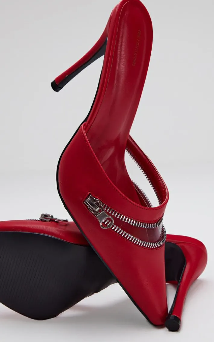 Take your shoe game to a whole new level with these mules. Featuring a red PU material with a pointed toe, zip detailing and a high stiletto heel, what’s not to love? Pair these with your look of the day for a glam finish.