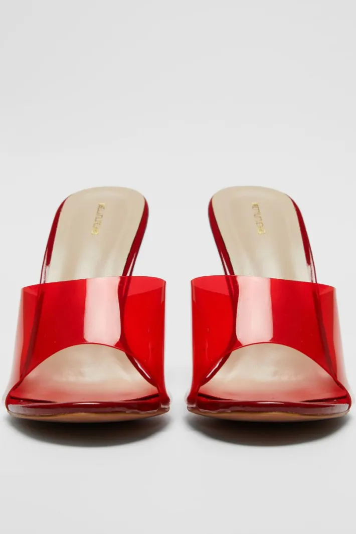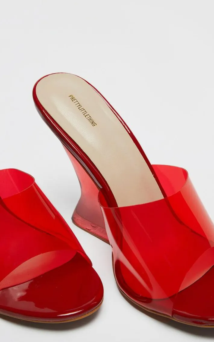Make a statement this season with these red PU round toe Perspex strap heeled wedges. Brought to you in a red PU material with a round toe design and Perspex strap detail, these heeled wedges are calling your name. Style with your fave outfit of the evening for a glam finish we can’t stop staring at.