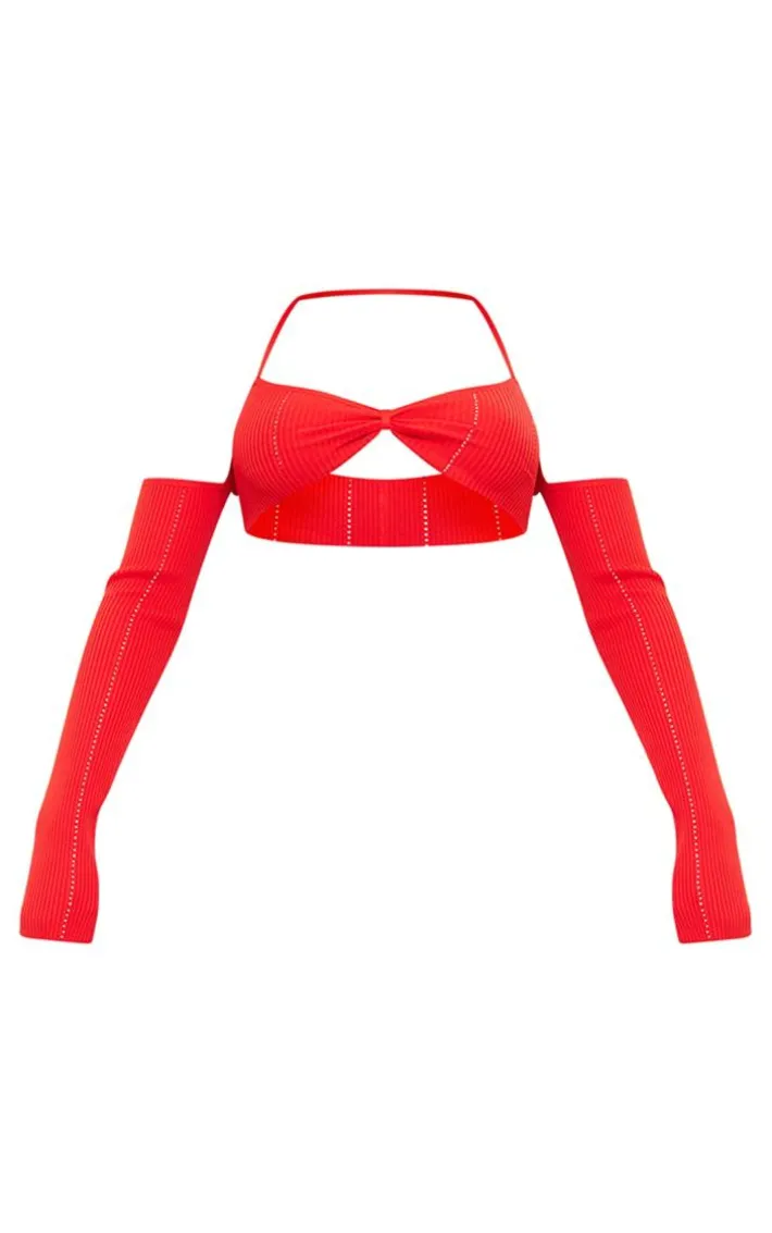 Stand out from the crowd in this red rib knit bardot tie neck top. Brought to you in a red hue rib knit material with a bardot neckline, a tie neck design and a cropped fit, how can you not be obsessed? Team this red top with the matching pants, heels and gold accessories for a look that is sure to make a serious style statement.