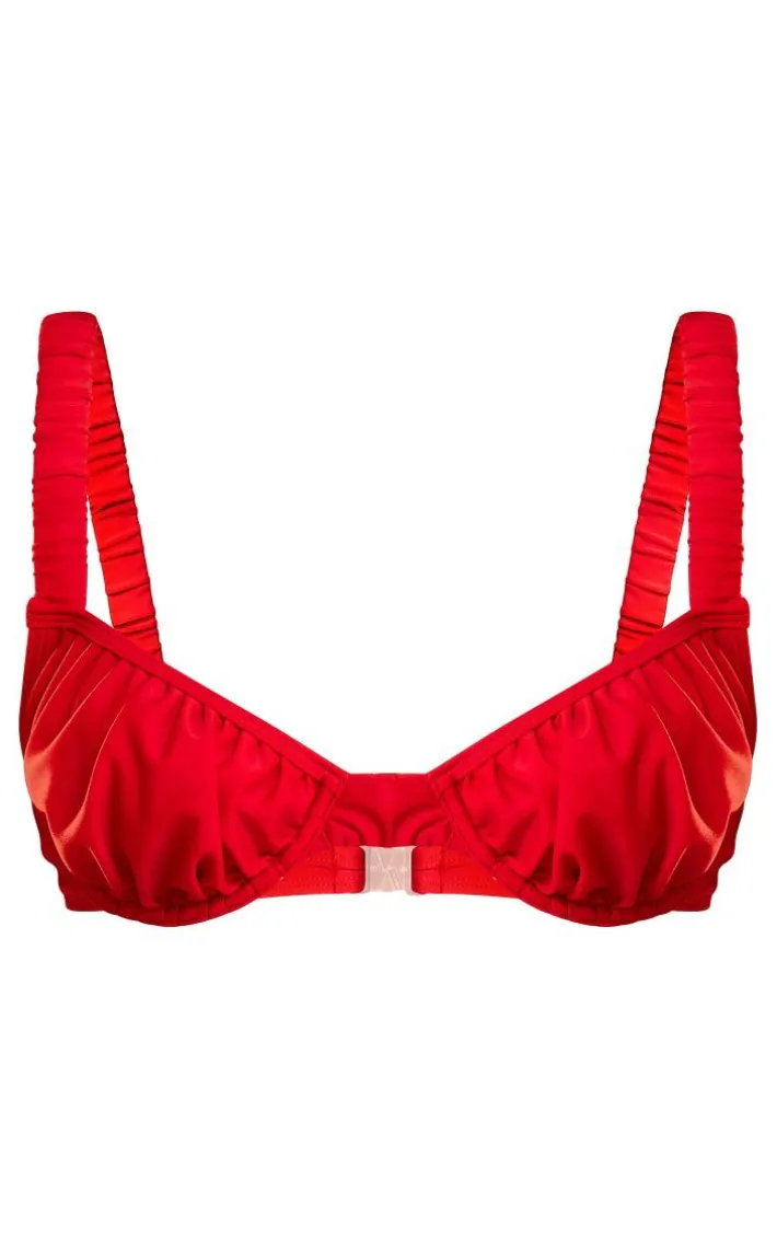 Turn up the heat on your vacay wardrobe with this red ruched underwired bikini top and be prepared to steal all the stares. It features a bold red hue material with a ruched detailing and an underwired design, we’re in love and we know you will be too. Style with the matching bottoms and gold accessories to elevate the look further.
