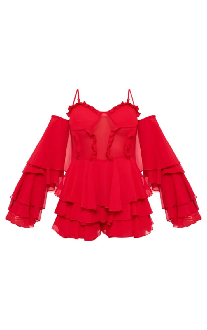 We’re totally in love with this red ruffle detail chiffon frilly skort romper for your weekend plans. It is made from a red chiffon material with frill detail, how could you not be obsessed? This romper gives you endless styling potential and is bound to give your look that extra chic touch. Style seamlessly with high heels and gold accessories for a seriously luxe finish.