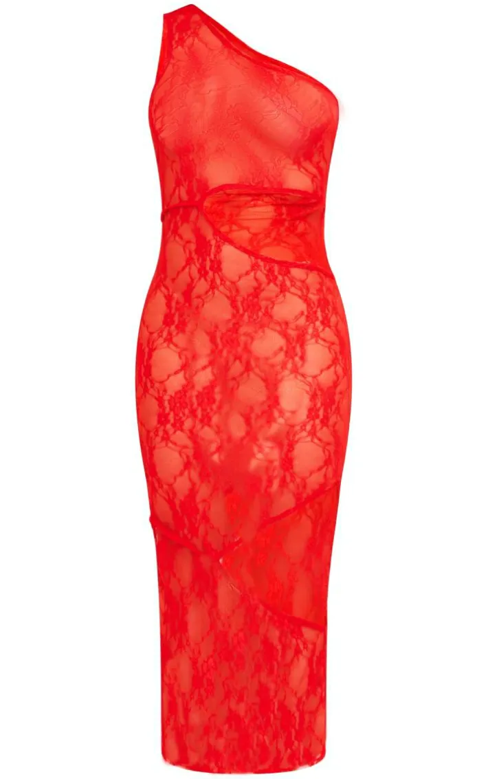 Bring the drama to your weekend look with this red sheer lace one shoulder multi cut out midaxi dress. Brought to you in a red hue sheer lace material with a one shoulder design, multi cut out detailing and a figure-worshipping midaxi fit, how can you resist? Style this midaxi dress with clear strap heels and statement accessories for a look that is sure to steal the stares all night long.