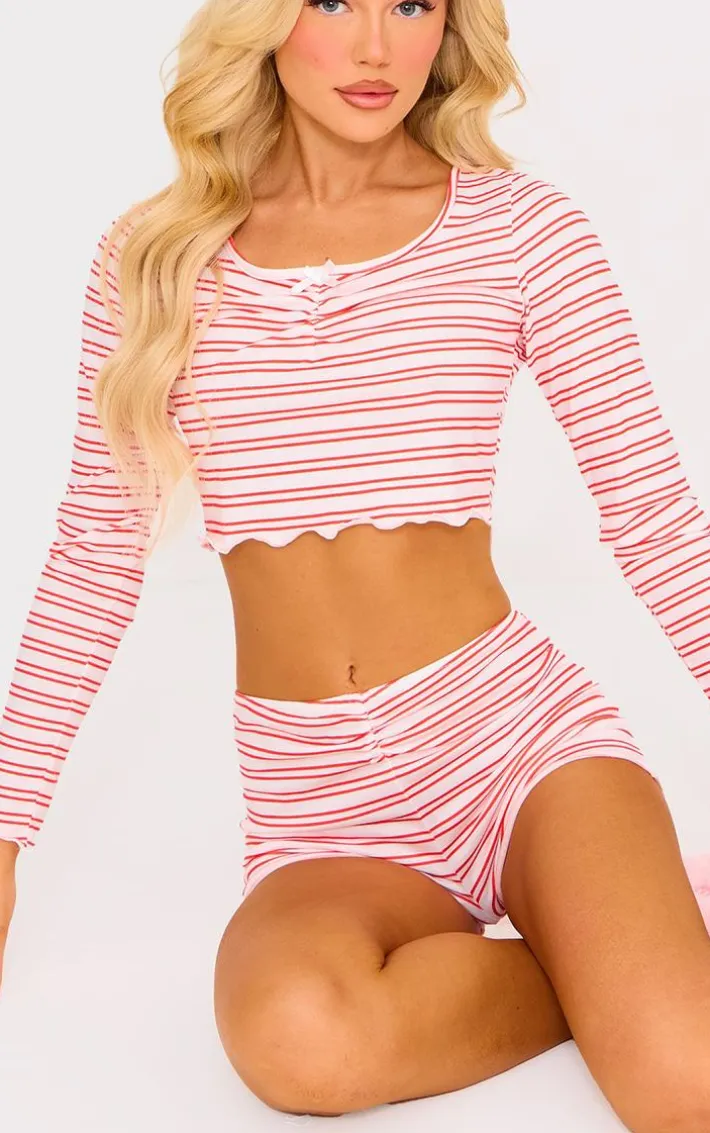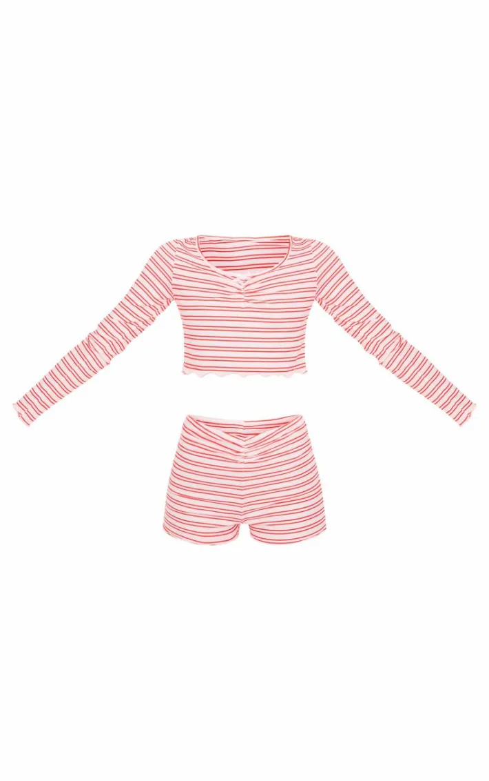 Keep it comfy with this red stripe long sleeve top and short pj set. Brought to you in a red stripe material with a long sleeve design and a pair of shorts, what more could you want? This pj set is perfect for those nights in. Team with your fave accessories and some fluffy socks for a chilled out look we are loving.