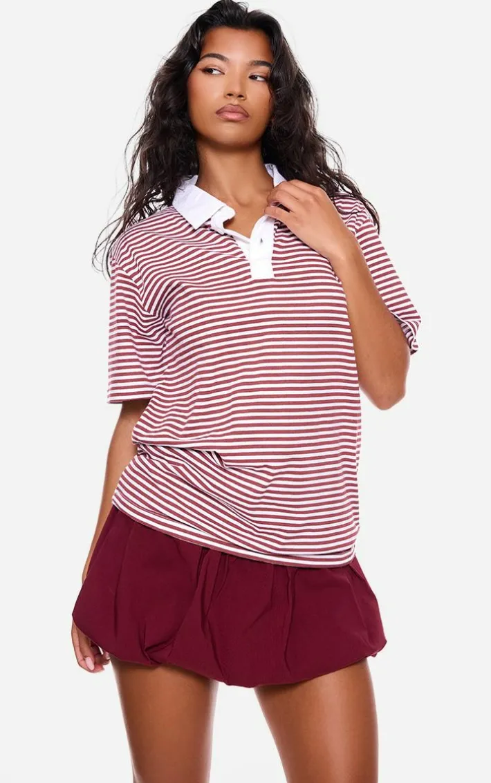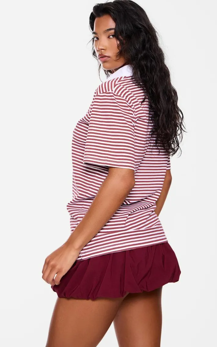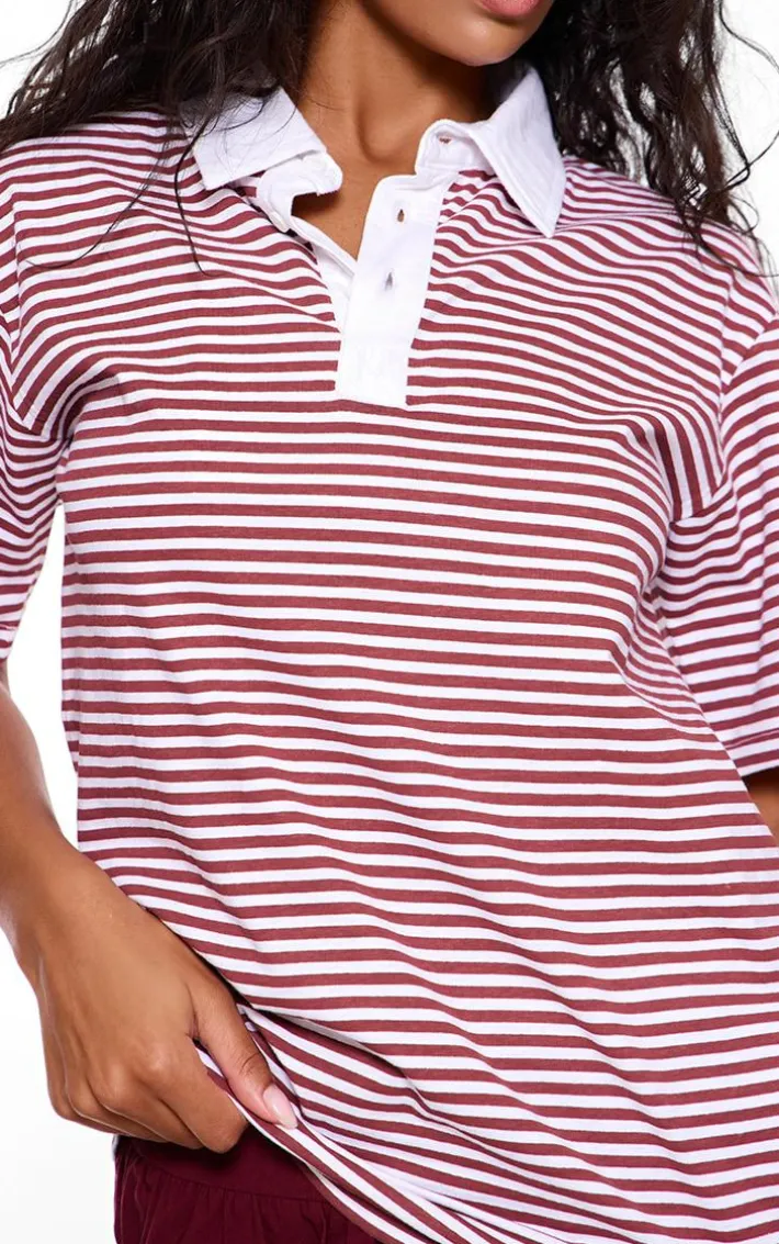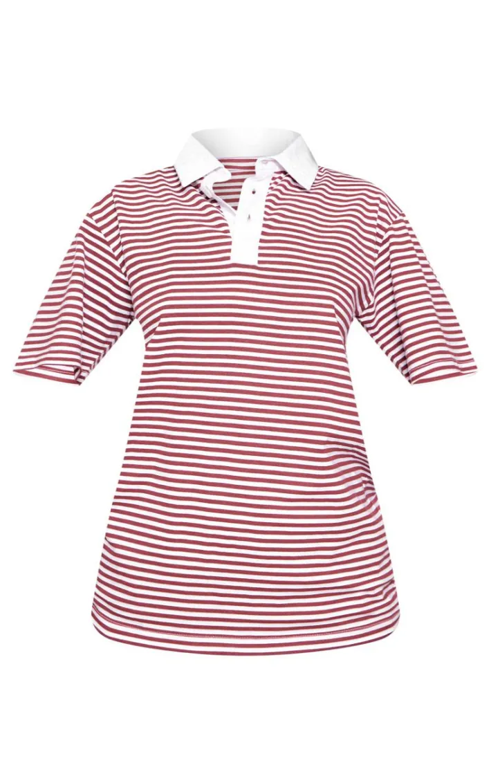Deciding what to wear just got easier with this red striped collared oversized T shirt. Brought to you in a red striped material with a collared design and oversized fit, this T shirt is all the new you need. Pair with a puffball skirt, knee high boots and simple accessories for a look like no other.