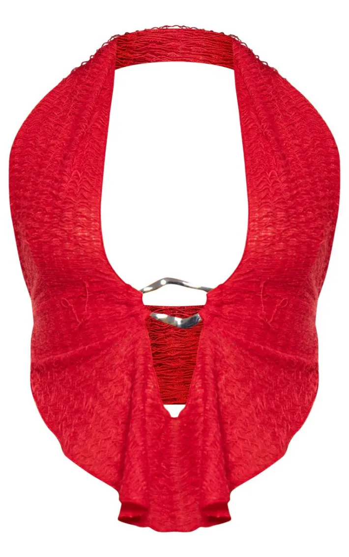 Bring some drama to your weekend look with this red textured ring detail halterneck top. Brought to you in red textured material with a halterneck design and ring detailing, how can you say no? Pair this red top with the matching skirt, heels and statement accessories for a look that is sure to turn heads for all the right reasons.