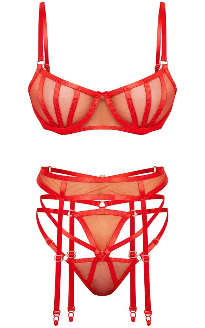 Your after-dark outfit is finally sorted with this sultry lingerie set. Featuring an underwired bra, strappy thong, and suspender belt, all in a red mesh material. Just add matching stockings to complete the look.
