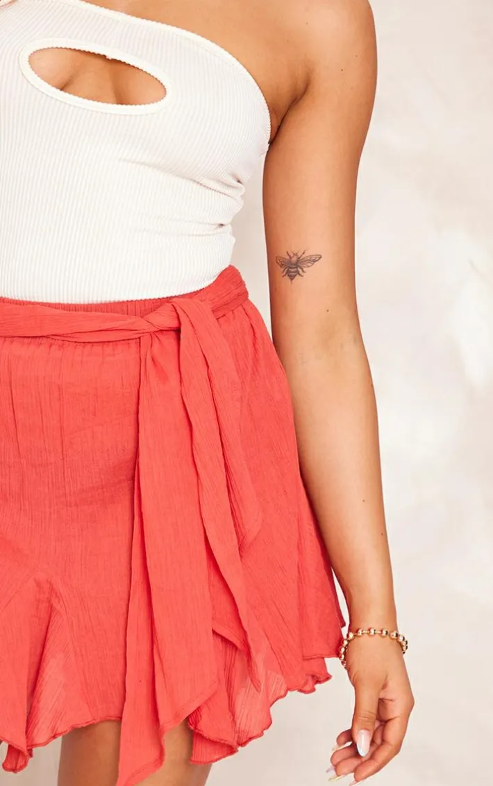 The new season is here so get ready to enter it in style with this rust cheesecloth handkerchief hem tie waist mini skirt. Made from a rust hue cheesecloth material with a handkerchief hem design, tie waist detailing and a mini fit, what’s not to love? Style this mini skirt with a bandeau top and western style boots for a look that is sure to get you noticed.