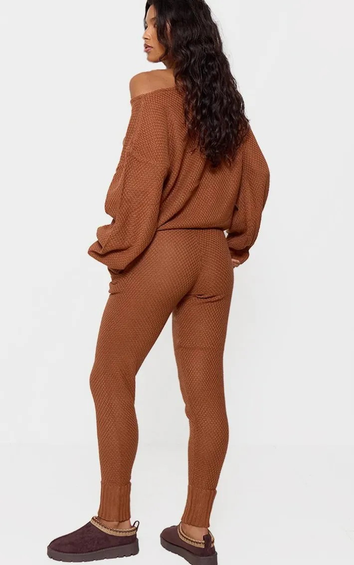 Look like the ultimate style icon whilst enjoying this lounge set’s maximum comfort. Featuring an off-the-shoulder top with elasticated waistband bottoms, both in a rust waffle knitted material. Simply complete the look with a fresh pair of kicks and varsity jacket.