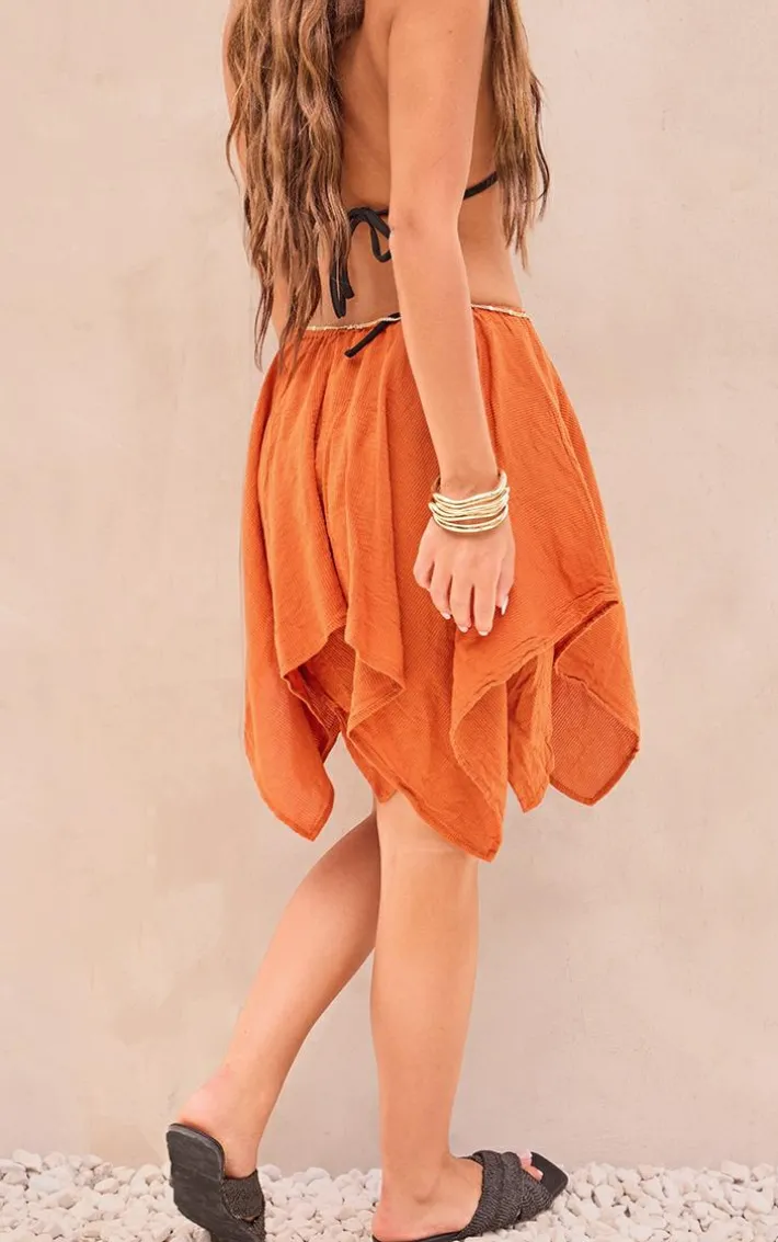 Make sure your new season look stays on trend in this rust textured woven handkerchief hem midi skirt. Brought to you in a rust hue textured woven material with a handkerchief hem design and a midi fit, how can you resist? Style this midi skirt with a crop top and gold accessories for a look that is sure to have all eyes on you wherever you go.