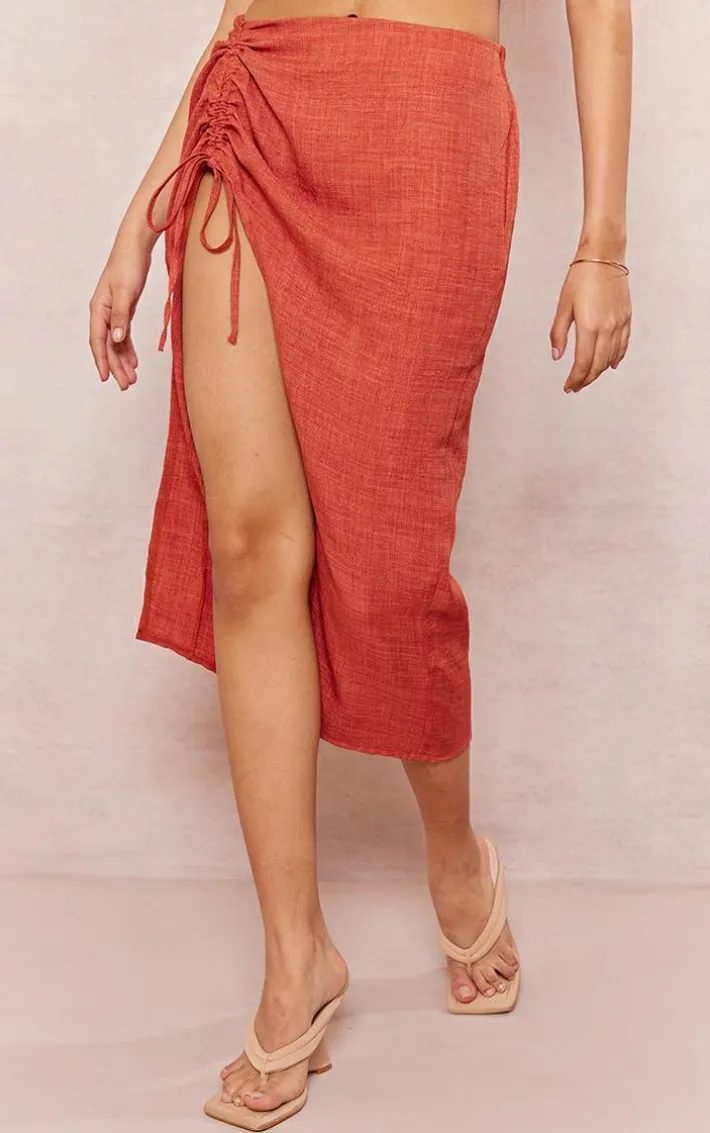 Add some statement hues into your new season wardrobe with this rust woven marl ruched side midi skirt. Perfect for the warmer seasons this women’s midi skirt is brought to you in a rust woven material with ruched sides and a midi length, what more could you ask for? To level up the look style this effortlessly with a white bandeau and sandals for a fresh new vibe.