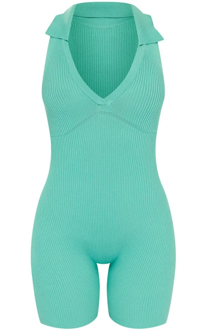 Add a fresh pop of bold tones into your wardrobe ready for the new season with this sage collared rib knit romper. Brought to you in a sage rib knit material with a plunging neckline and a collared design, how could you say no? This romper is just what you have been searching for and is perfect for those off-duty days. Simply pair with chunky sneakers and gold hoop earrings for a ready-to-go look.