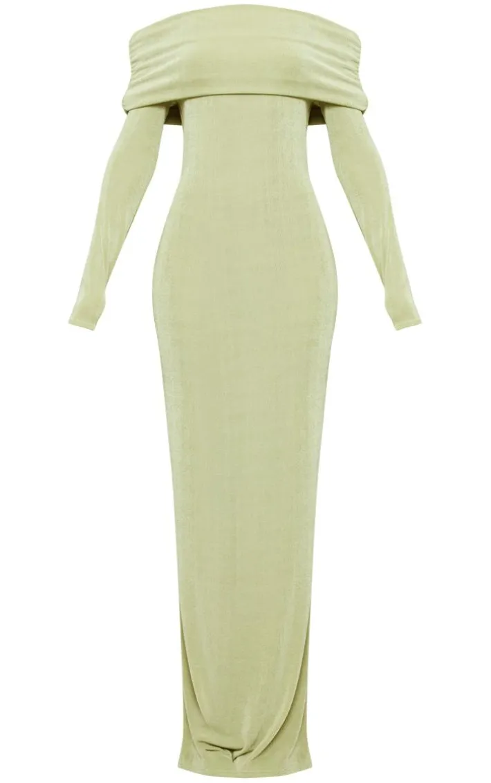 Be a showstopper this weekend with this sage green acetate slinky bardot long sleeve maxi dress. Its sage green acetate slinky material is seriously flattering whilst its bardot neckline adds all the chic vibes to your look. This maxi dress is the ultimate glam piece which is sure to impress whatever your plans are. We are loving it paired with dreamy heels and gold accessories for that luxe finish.