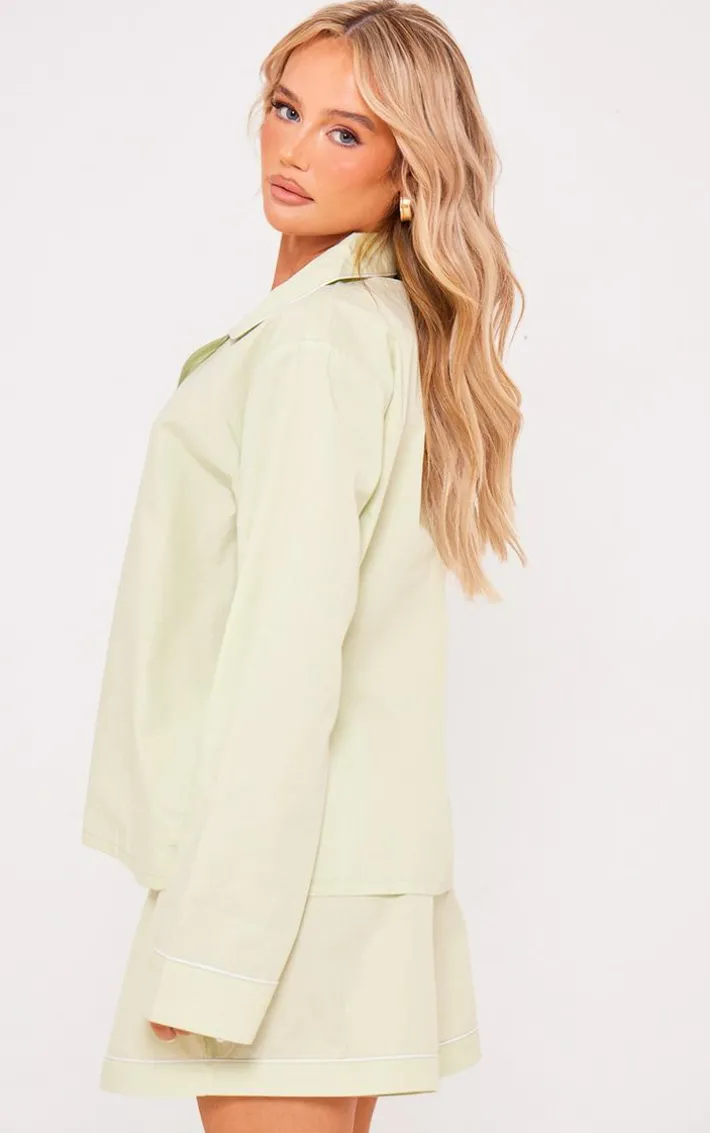Get ready to add some dreamy pastel hues into your pajama collection with this sage green cotton poplin piping long sleeve shirt and short pj set. This set includes a long sleeve shirt and matching pj shorts, both in a sage green cotton poplin material with piping detailing, how can you not fall in love? Simply add fluffy slippers for the perfect night in look.