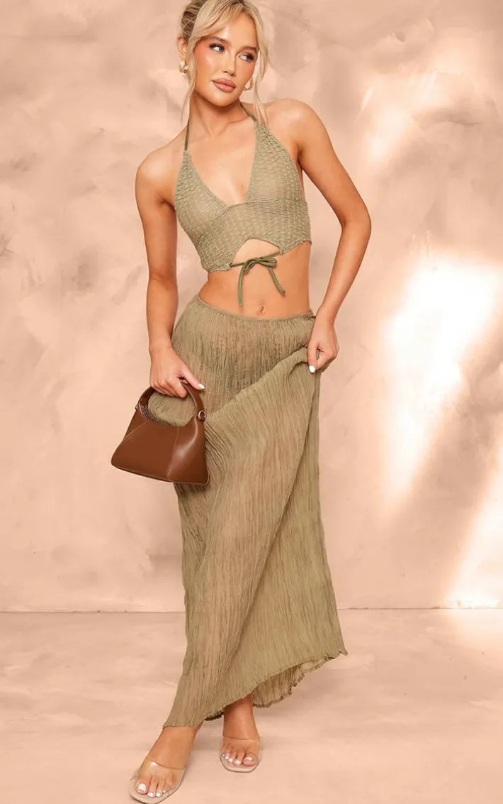 Get ready to have heads turning for all the right reasons with this sage green crinkled sheer woven maxi skirt, we’re obsessed. This skirt features a sage green crinkled sheer woven material with a maxi length and a relaxed fit, you won’t be able to resist this dreamy piece. Pair with the matching top, heels and a mini bag for a look that is perfect for your next date night.