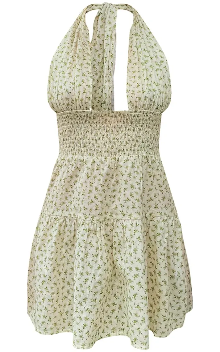 Keep it chic with this sage green ditsy floral shirred cross halterneck shift dress. Brought to you in a sage green material with a floral design, you wont blend in. Its halterneck cross design gives you a flattering fit like no other. Team this shirred dress with your fave accessories and a pair of comfy sneakers to finish off the look we are loving.