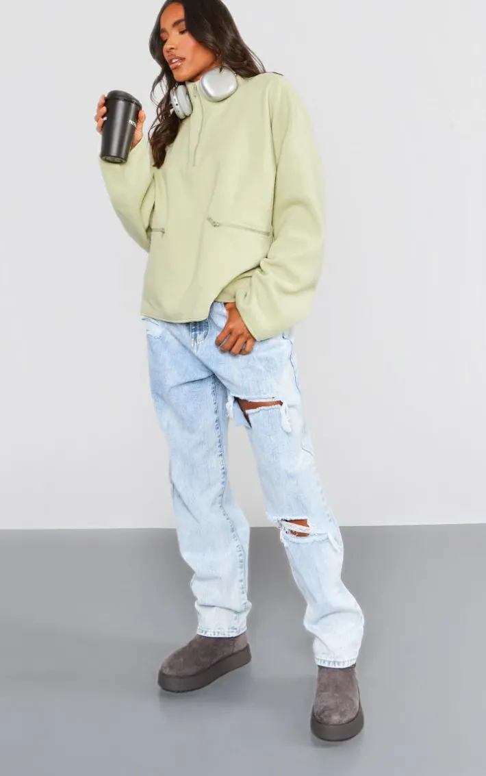 Every needs to upgrade their wardrobe with this sage green fleece quarter zip pocket detail sweatshirt. Its sea green fleece material brings all the cosy feels to your look and its quarter zip design adds a touch of luxe. This sweatshirt also features pocket detail which gives your look that extra edge. Team with denim jeans, chunky boots and everyday accessories for a look that will set trends wherever you step foot.