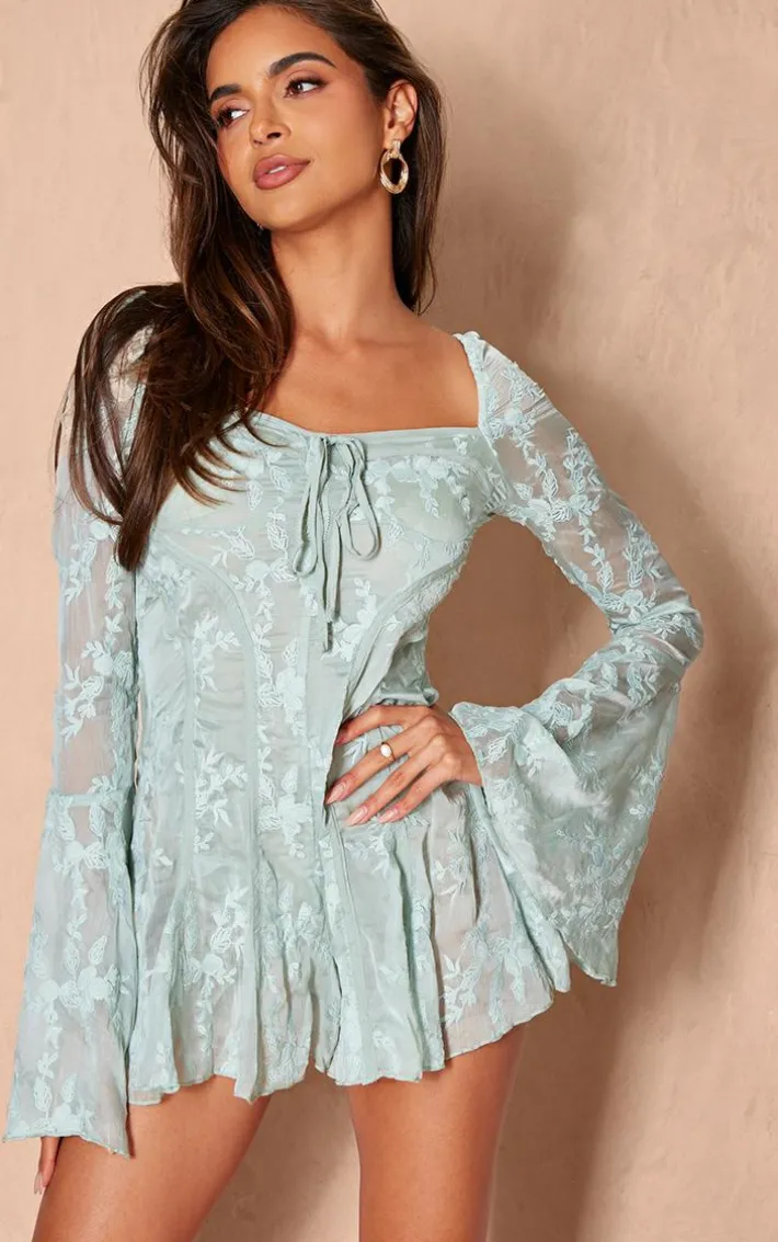 Get ready to have all eyes on you with this sage green lace binding detail flare sleeve romper. Brought to you in a sage green material with lace binding detail and flared sleeves, what’snot to love? you’ll be sure to earn all the likes with this dreamy piece. Finish off the look by pairing this with high heels and accessories. It’s a yes from us.Â