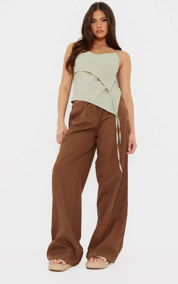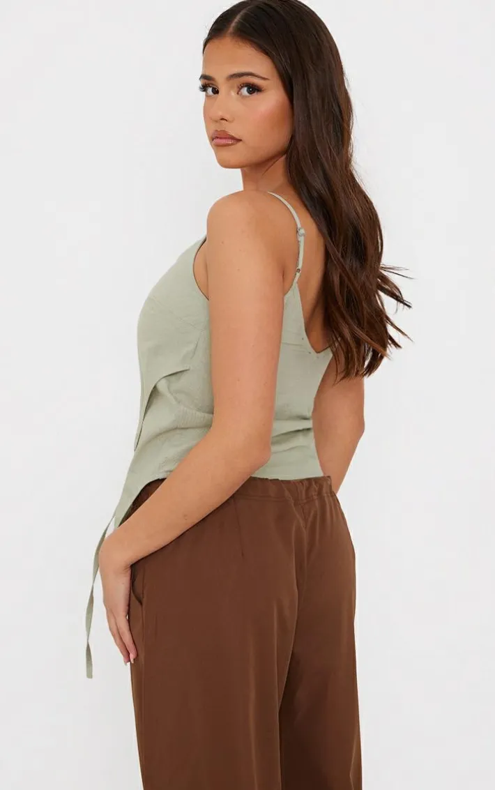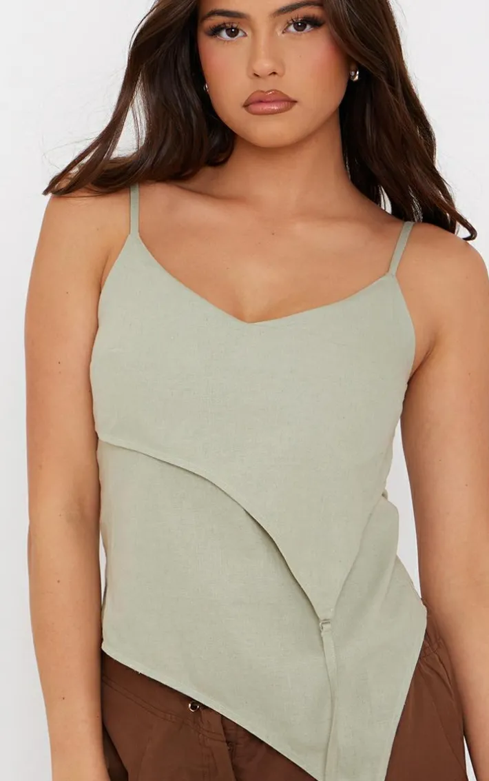 Add some dreamy pastel hues into your new season wardrobe with this sage green linen asymmetric strappy detail cami top. Brought to you in a sage green linen material with an asymmetric design and strap detail, how can you say no? Style this cami top with wide leg pants and flatform sandals for an effortless everyday look like no other.