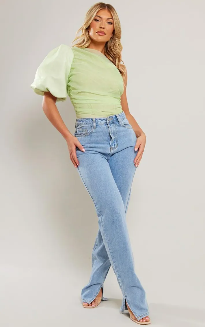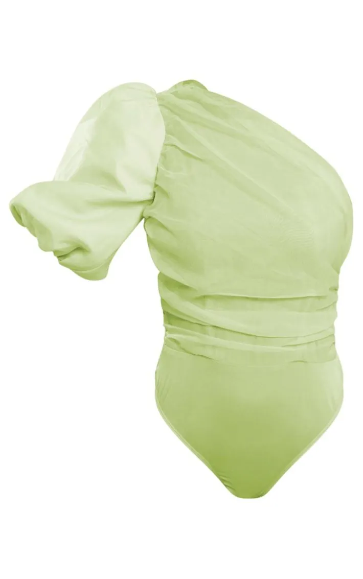 Get your glam on with this sage green organza detail one shoulder bodysuit. Made from a sage green material with an organza detail and a one shoulder design, you’re sure to have all eyes on you. When the weekend calls so does this women’s green bodysuit. So what are you waiting for? Shop the look and opt for blue denim jeans, high heels and a white mini bag for a glam finish.