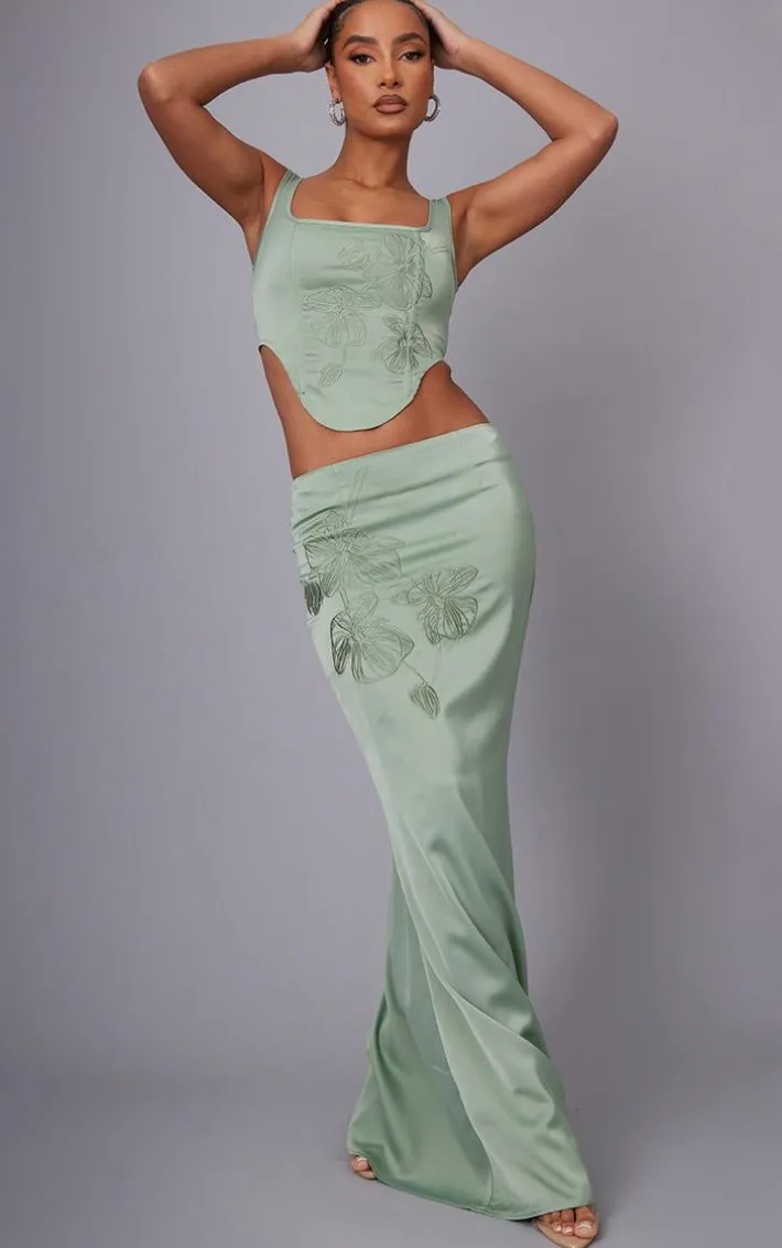 Amp up the chic vibes with this sea green satin floral embroidered midaxi skirt. It’s sure to be your new go-to. Made using a sage green satin material with a floral embroidered print and a flattering fit that will earn you all the likes, what more could you ask for? This women’s skirt is sure to be a staple. Simply pair with the matching corset top, high heels and gold hue accessories for a glam vibe that won’t go unnoticed this weekend.