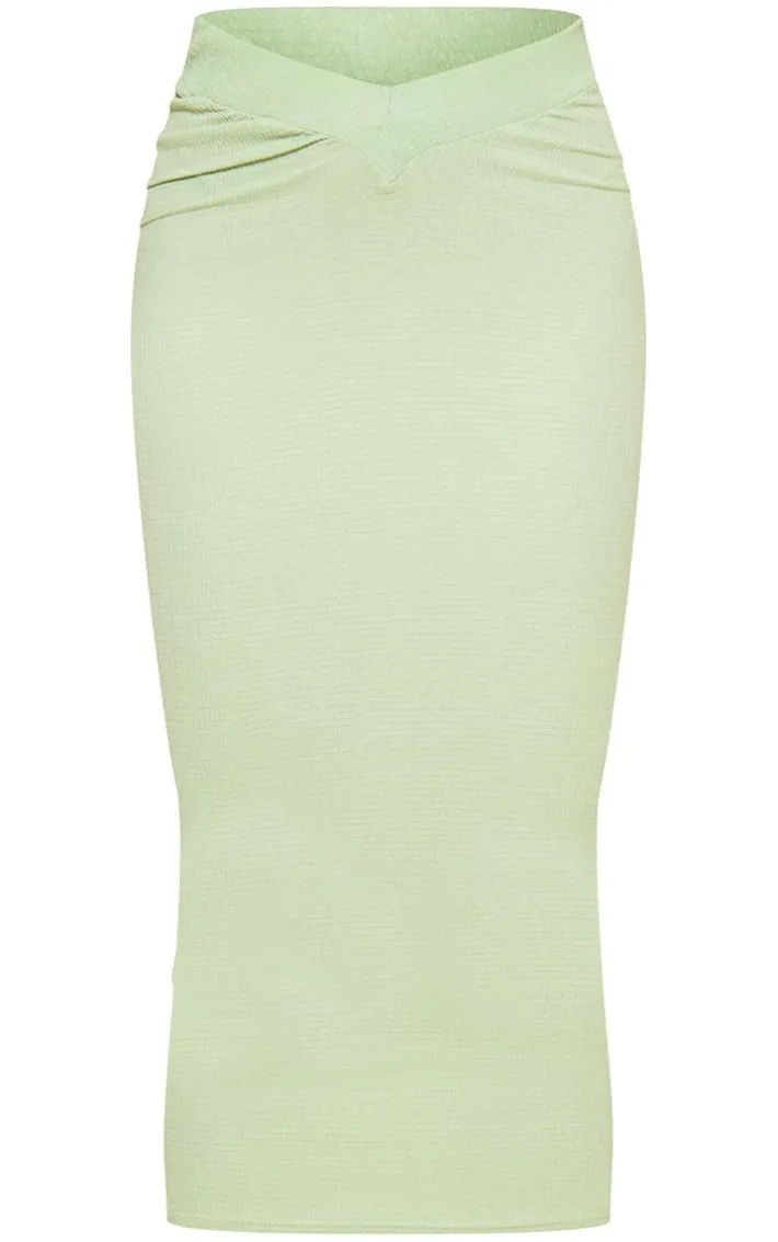This sage green textured rib v waist midaxi skirt is sure to be at the top of your new season hit list. Featuring a sage green textured ribbed material with a V waist design and a midaxi length, how could you say no? Whether you’re heading on vacay or you’re meeting up , this midaxi skirt ticks all the dress code boxes. Pair with a crop top and heeled mules for a fierce finish.