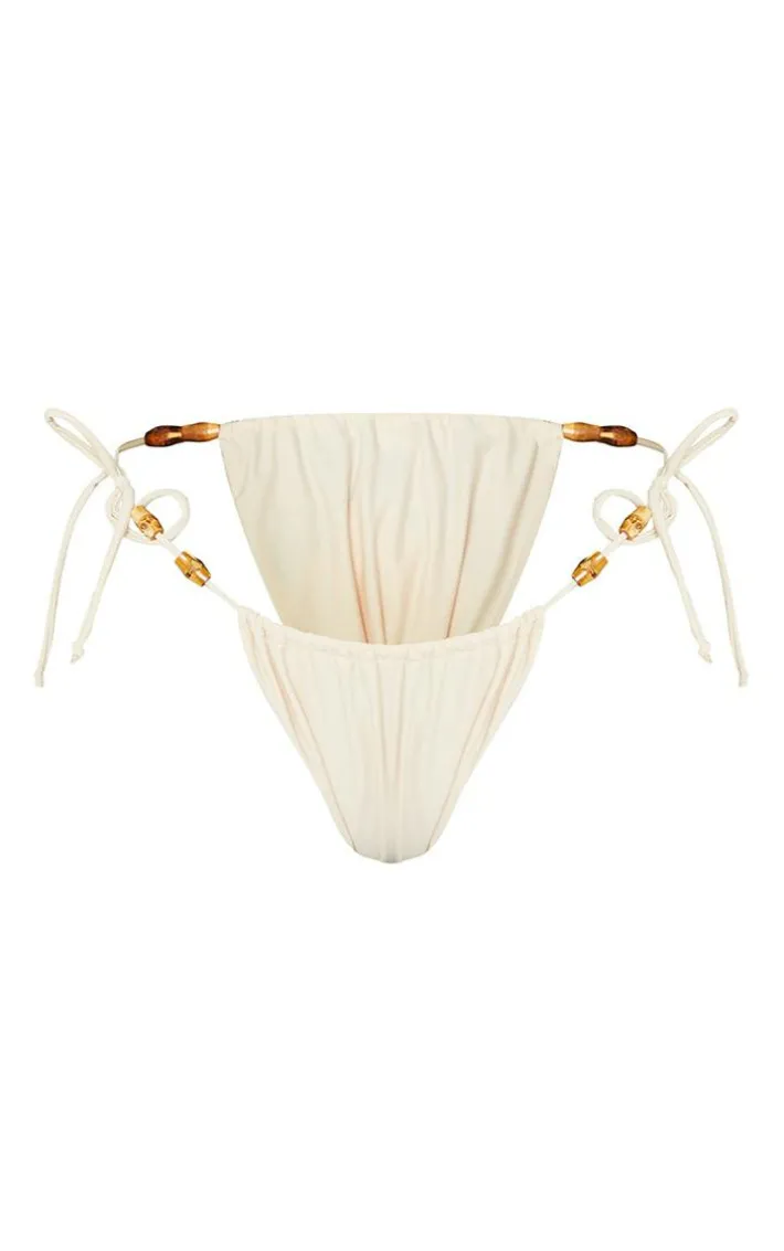 Sand Wooden Bead Ruched Tanga Tie Side Bikini Bottoms
