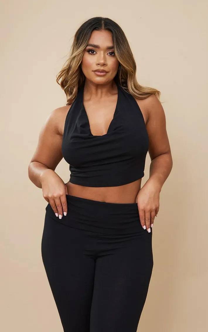 Bring all the chic vibes to your off-duty look with this black contour jersey cowl neck crop top. Whether you want to switch up your everyday look or dressing up for a night with the dolls, this shape crop top is just what you need. With a black contour jersey material, cowl neck design and a cropped length, how could you say no? Effortlessly style with matching bottoms, box-fresh sneakers, and staple accessories for a vibe everyone will want.