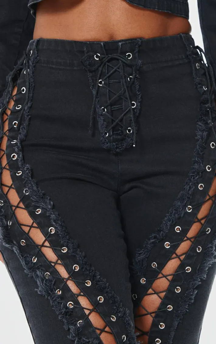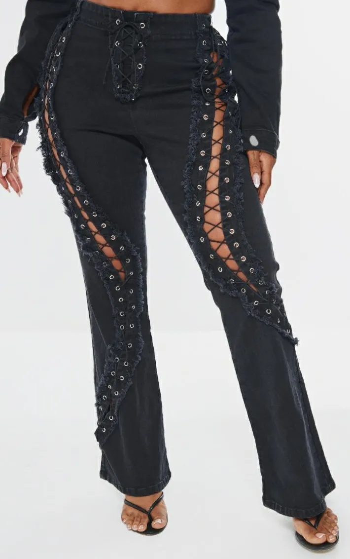 Show off your shape with these shape black denim lace up detail flare jeans. Brought to you in a black denim material with a lace up detail and a flared design, you are sure to turn heads for all the right reasons. Pair with the matching cropped jacket and your go-to heels to finish off the look everyone is talking about.