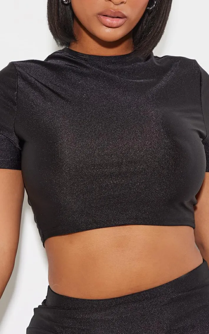 Keep it simple yet stylish with this crop top. Featuring a black disco material with short sleeves, a cropped length and a sculpting fit, we’re in love. Wear with the matching skirt, black knee-high boots and accessories for an insta-worthy combo.