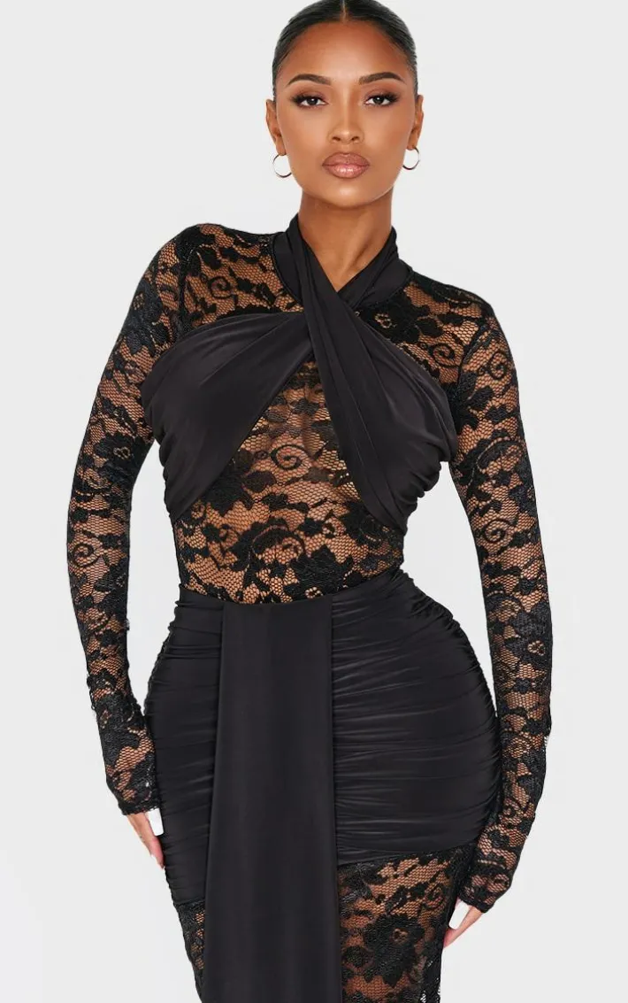 You are guaranteed to add a touch of chic to your weekend look with this shape black drape detail lace bodysuit. Made from a black lace material with drape detailing, how can you say no? Style this lace bodysuit with a skirt and burgundy heels for a look that will have eyes on you wherever you go.