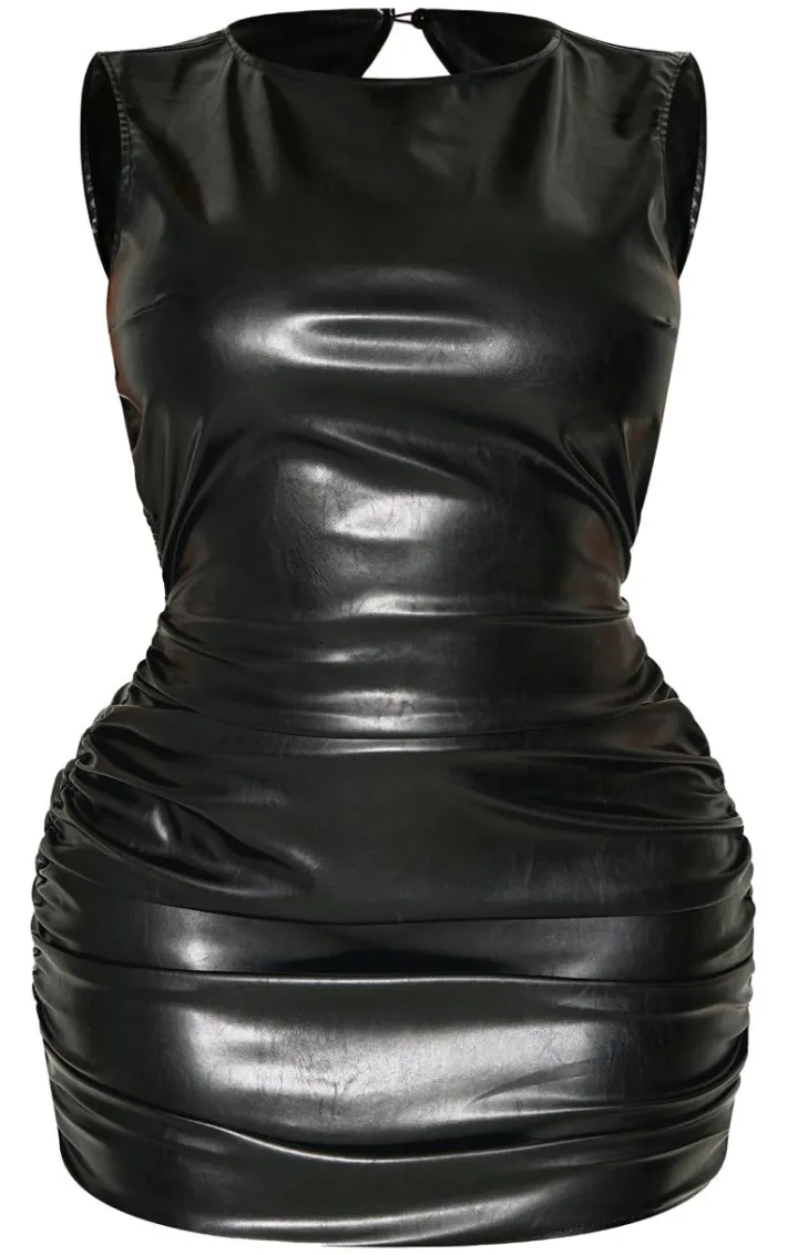 Introducing the head-turning shape black faux leather open back dress. It’s a statement evening piece that will have you looking all kinds of fierce. Brought to you in a black faux leather fabric with an open back feature and figure hugging fit, why not pair with black strappy heels, gold hoops and a faux leather handbag?