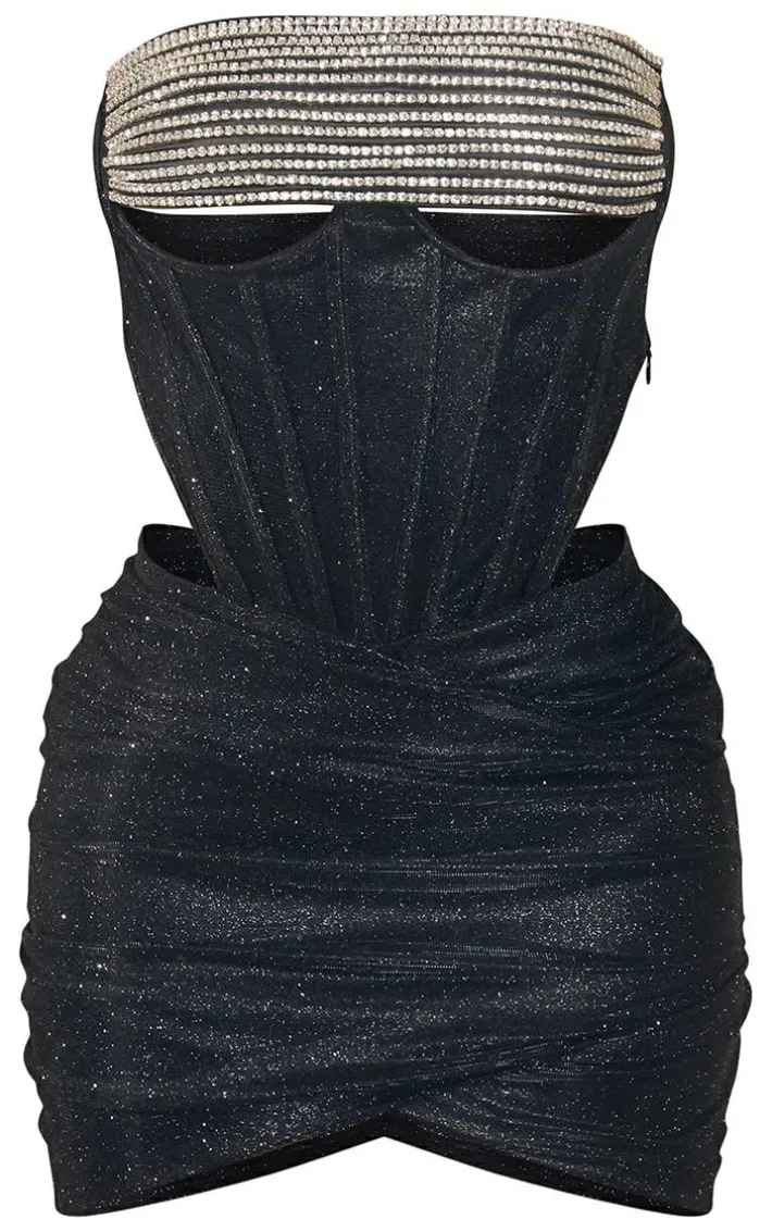 Steal all the stares in this seriously glam dress. Featuring a black glitter material with corset detailing and a diamante front panel. Just add strappy heels and silver accessories for a look we can’t get enough of.