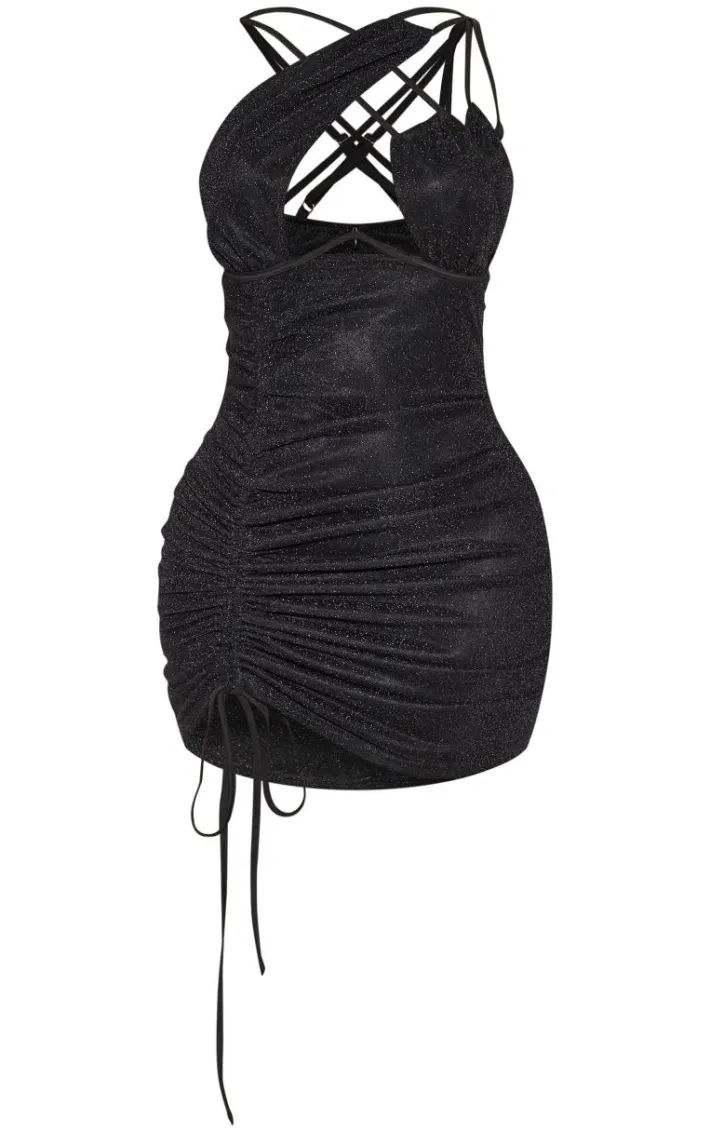 Got plans for the weekend ? Then this dress is a must. Featuring a black glitter material with cup detail, ruched side design and a bodycon fit. Style this with statement heels and gold hue accessories for a date-night worthy look.