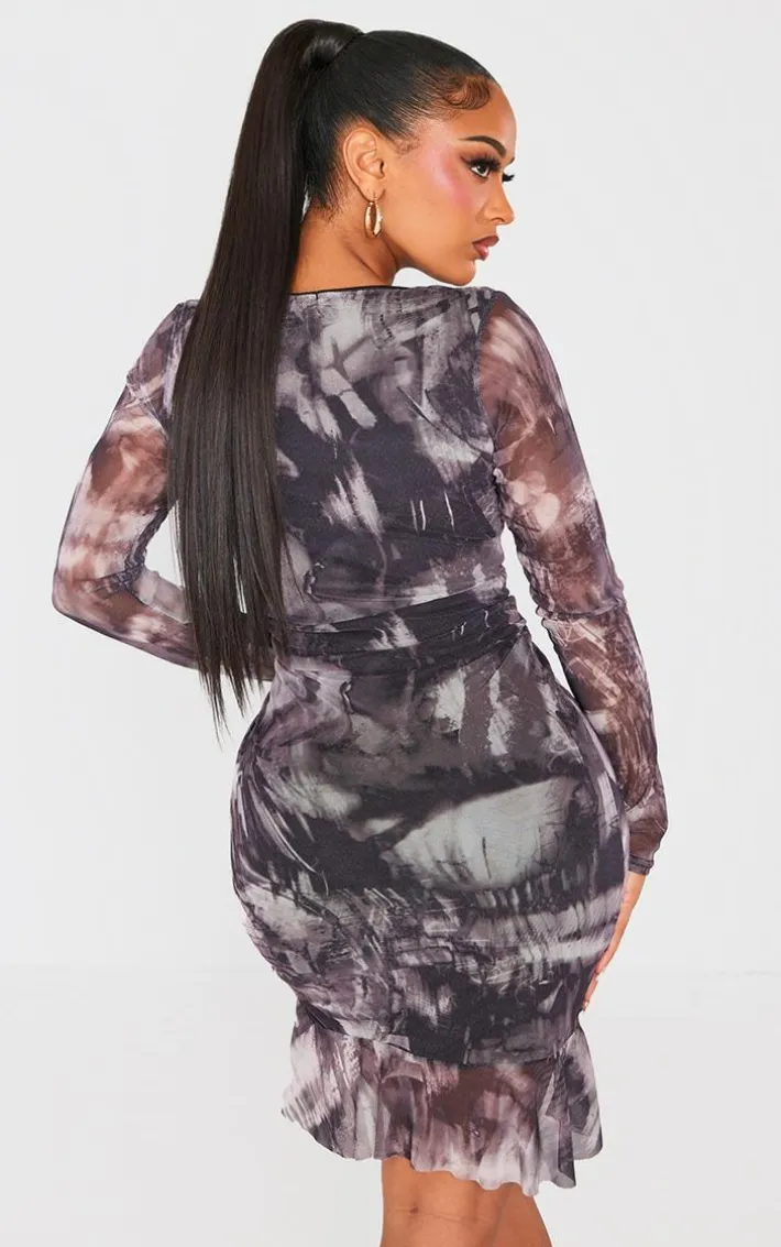 When the weekend calls for a little drama this shape black grunge printed mesh ruched side frill hem bodycon dress will have you at the center of attention. It is made using a black grunge printed mesh material with a ruched side and a frill hem, what more could you want ? Style this dress with clear slip-on heels and statement accessories to elevate the look further.