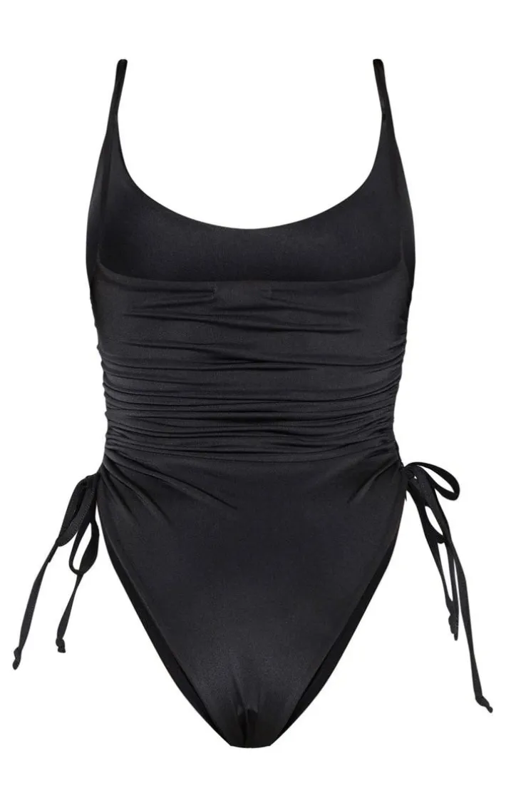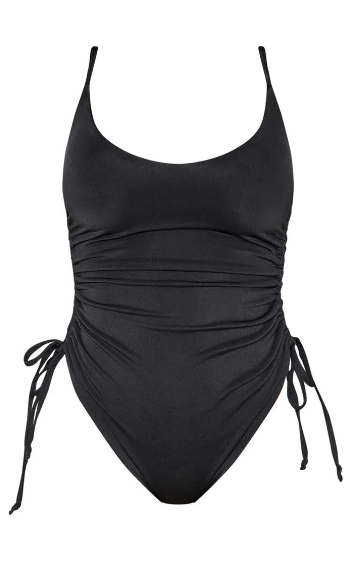 Update your vacay collection with this swimsuit. Featuring a black material with ruched side detailing and a high rise fit, we’re obsessed. Pair this with sandals and oversized sunnies for a day by the pool.